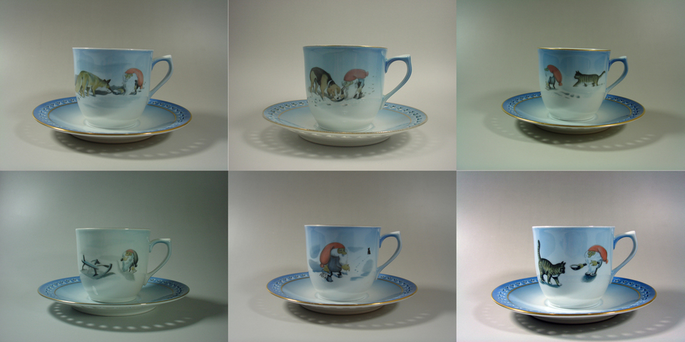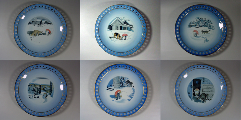 北欧スカンジナビア、デンマークのコペンハーゲンで1853年創業のビング&グレンダール陶磁器窯。ロイヤル・コペンハーゲン陶磁器窯のライバル会社として合併する1987年まで人気のあるテーブルウエアの数々を生み出してきました。このトムテシリーズは、スウェーデンの絵本作家ハラルド・ウィーヴェリが、北欧に昔から伝わる妖精トムテの神話で描いたモチーフを写し取ったものです。トムテは、どの家にも守り神として住み、動物達とだけ話しが出来る妖精です。モチーフは、トムテと猫、犬、キツネ、ネズミが描かれています。